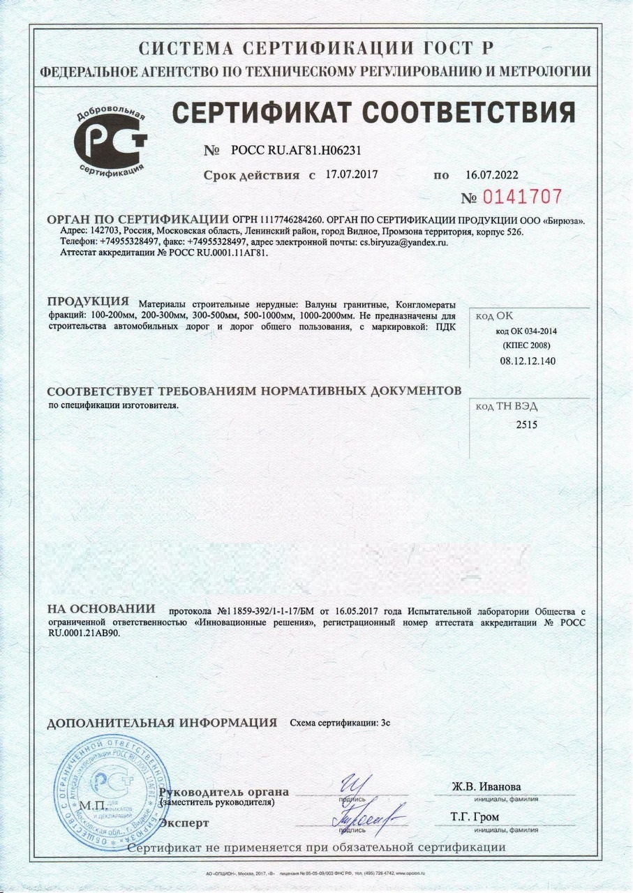 Сертификат соответствия – документ, подтверждающий соответствие продукции требованиям качества и безопасности, установленными для нее действующими стандартами и правилами. Наш камень, который Вы сможете заказать с доставкой в Пензе , обладает всеми необходимыми документами для реализации и при необходимости могут быть предоставлены все необходимые подтверждающие документы при поставке.