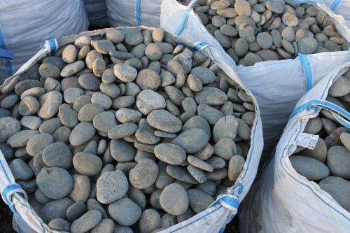 Крупная галька этого типоразмера (от 100 до 300 мм) уже напоминает небольшие валунчики: это красивый и гладкий речной камень, получивший свою округлую форму от сил природы – волн и течений. Благодаря удобной уплощенности отделка этим натуральным камнем становится очень простой: по сути, это готовая естественная облицовочная плитка или брусчатка для мощения. Такая галька, цена которой у нас низка благодаря собственной добыче, отпускается в мягких контейнерах или насыпом в кузов машины, тоннами. Эти симпатичные плоские натуральные камни у нас можно поистине удачно купить оптом!