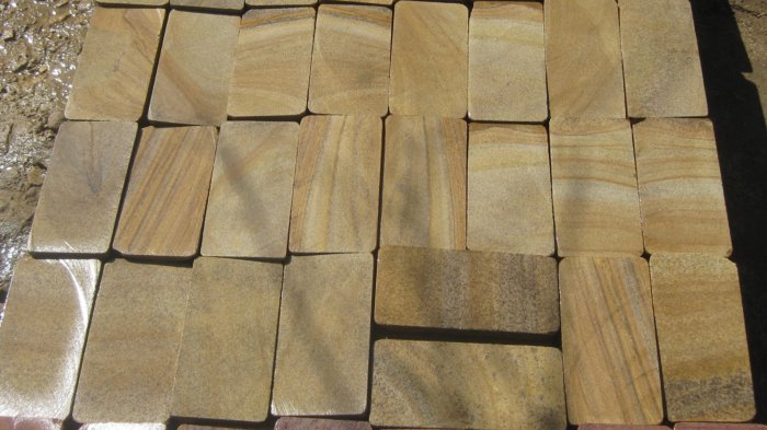 Kamenclub.ru: Песчаник пластушка желтый с рисунком (7-15 см)  купить в Пензе плитняк - пластушка - бут желтый песчаник 10200 руб/м3   фото КАМЕНЬ КЛУБ